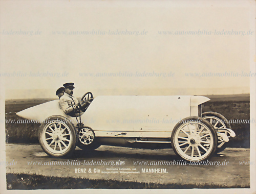 Original s/w Aufnahme / Werksfoto Fritz Erle am Steuer des Blitzen-Benz, mit Eindruck "Benz & Cie Mannheim, 18x24cm, kleinerer Einriss am linken Rand, seltene Aufnahme