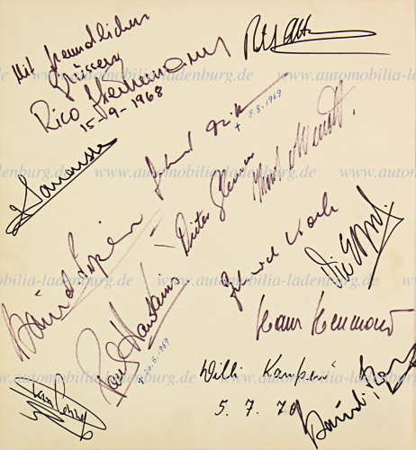 Handsignierte Albumseite, signiert von Gerhard Mitter; Paul Hawkins; Gerard Larrousse; Rico Steinemann; Gerhard Koch; Vic Elford; David Piper; Gijs van Lennep; Dieter Glemser; Karl von Wendt; Hans Herrmann; Willy Kauhsen...