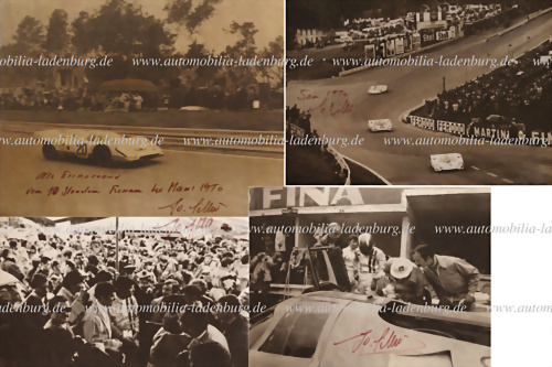Konvolut 4 handsignaturen auf original s/w Aufnahmen Jo Siffert, auf Porsche u.a. Le Mans 1970, verschiedene Formate