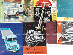 30er-60er Jahre, Konvolut 7 tlg. Prospekte/ Betriebsanleitungen Nutzfahrzeuge, darunter 1935 Mercedes-Benz Lo 3500 & LZ 8000 Untergestell Ersatzteilliste L 64 Ausgabe D; Betriebsanleitung L/0 319 D Ausgabe E; Prospekt Mercedes L 4500/ K/ SA mit Anlage; Henschel HS 100; MAN 120 PS Lastwagenmotor; Einblattprospekt Meiller Kipper sowie 1955 Ausgabe "Das Auto Tagebuch", de. Text, mit Gebrauchsspuren