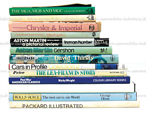 Bücherkonvolut 13 tlg. darunter u.a.: "Vintage Motoring in New Zealand" von E. Sarinson; "Frazernash" von D. Thirlby; "Aston Martin 1914 to 1940 a pictorial Review" von I. Hunter; "Aston Martin 1963-1972" von D. Gershon, etc. en. Text, tw. mit starken Gebrauchsspuren