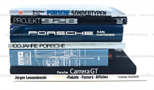 Bücherkonvolut 7tlg., darunter "Porsche Geschichte und Technik der Renn- und Sportwagen" von Karl Ludvigsen; "Porsche Plakate - Posters - Affiches" von Jürgen Lewandowski; "Das große Buch der Porsche Sondertypen und Konstruktionen" von Boschen und Barth; "Porsche Carrera GT" von Brümmer (ohne Schutzumschlag); "100 Jahre Porsche - Im Spiegel der Zeitgeschichte"; "Porsche 917 - Archiv - und Werksverzeichnis" von Walter Näher; "Projekt 928" von Julius Weitmann / Steinemann, kleinere Gebrauchsspuren am Schutzumschlag, ansonsten guter Zustand