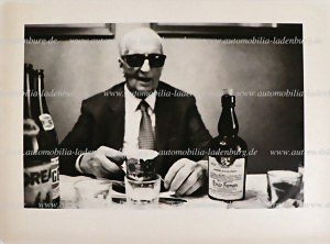 großformatige original s/w Aufnahme Enzo Ferrari am Tisch, vor Ihm eine Flasche "Blended Scotch Whiskey" mit dem Aufdruck "The Whisky in this Bottle is a blend if the finest selected Highland Scotch whiskies blended by expert craftsmen, selected and matured in Scotland by Enzo Ferrari", 30,5x40cm, gestempelt "Silvano Maggi Fotografo"