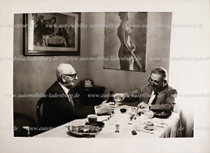 großformatige original s/w Aufnahme Enzo Ferrari mit Gianni Brera am Tisch, 30,5x40cm, Rückseite gestempelt "Silvano Maggi Fotografo"