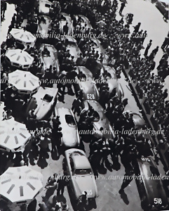 1955, original s/w Aufnahme Mille Miglia 1955, u.a. die Fahrzeuge, Ferrari 500 Mondial (#0536MD) von Luigi Taramazzo; Ferrari 118LM Scaglietti Spyder (#0484LM) von Piero Taruffi; Ferrari 500 Mondial Scaglietti Spyder (#0528MD) von Carlo Leto di Priolo; Moretti 750 Gran Sport; OSCA MT4 1100 von Claude Bourillot..., 22x18cm, gestempelt „United Press Photos“, kleine Fehlstelle am oberen rechten Rand