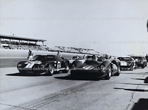 Original s/w Aufnahme, Startszene 2000KM Daytona 1965, u.a. Rodriguez / Surtees auf Ferrari 330P2 (#0826), neben Bondurant / Ginther auf Ford GT40, 18x24cm