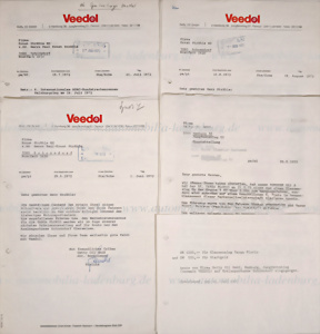1972-73, 12 Seiten Schriftverkehr Firma Veedol (Getty Oil GmbH) und Firma Ernst Strähle KG, u.a. Vertrag der Veedol GmbH Hamburg und Ernst Strähle KG für die Motorsportsaison 1972, datiert 17.04.1972 & 04.05.1972; Schreiben betreffend Klassensieg bei der 56. Targa Florio von Steckkönig / Pucci auf Porsche 911 ST (#911.230.0870), sowie den 2.Platz in der Klasse 1600-2000ccm Schmid / Floridia auf Porsche 914/6 (#915.043.0161), datiert 29.05.1972; Überweisungsbeleg der Firma Getty Oil GmbH Hamburg an Strähle KG (1200DM für den Klassensieg, sowie 500DM Startgeld), datiert 13.06.1972; weitere Schreiben über sportliche Erfolge von Dieter Schmid beim ADAC Bergrennen in Dendelbach 1972 / Bergpreis Schwäbisch Alb-Neuffen 1972 / Bergpreis Steibis 1972 Schmid auf Porsche 911 ST (#911.230.0870); Erfolge beim Bergpreis Freiburg Schauinsland 1972, Schmid auf Porsche 914/6 (#915.043.0161); Steckkönig Sieger beim ADAC-Rhein-Mosel-Pokal auf 911 ST (#911.230.0870), etc.