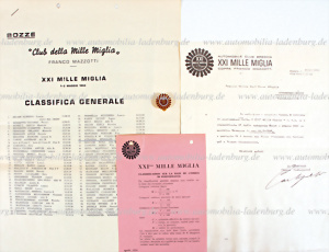 1954, Konvolut darunter handsigniertes Schreiben von Renzo Castagneto an Paul Ernst Strähle, hier bestätigt Castagneto Paul Ernst Strähle den Klassensieg in der Kategorie 1300ccm Sport bei der XXI. Mille Miglia 1954, ebenso das ihm für den Klassensieg einen Silberpokal zusteht, den er ihm gerne zur Verfügung stellen möchte, datiert 13.11.1954, inkl. 5 Seiten Ergebnislisten, Allgemeine, sowie nach Kategorie und Klassen. Strähle / Spingler auf VW 1300, in der Kategorie 1500ccm gelistet mit 3. Platz hinter Linge / Hermann auf Porsche 550 (#08) und Cabianca auf OSCA MT4 1500 (#1142), dazu Einblattprospekt Klassifizierung auf Grundlage des Indexes, ital. Text, datiert 06.April.1954, sowie Ansteckbrosche (Reverseknopfanstecker), nur für Teilnehmer 1x Rückseite graviert „Concorrente“, Durchmesser 2,1cm