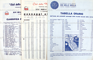 1954, Konvolut 3tlg., XXI. Mille Miglia, darunter Zeittabelle „Tabella Orario“; 12 Seiten Schritte zu den Kontrollen „Passaggi ai Controlli“, sowie 4 Seiten Ergebnislisten nach Kategorie und Klassen