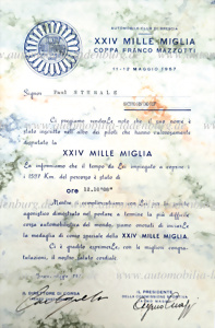 1956, original Teilnehmerurkunde für den 4. Platz in der Klasse GT 1.3, „XXIII. Mille Miglia Coppa Franco Mazzotti“, Paul Ernst Strähle und Joseph „Sepp“ Greger auf Porsche 356A 1300 Super, handsigniert von Renzo Castagneto und Aymo Maggi, 22,5x15cm, inkl. Briefumschlag, Rarität