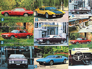 Konvolut 8 Werkspostkarten DeTomaso, darunter Pantera GTS, 3x Longchamp 2+2, 3x Deauville 4 porte, Pantera L, je 10,5x14,5cm