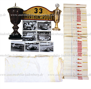 1965, Konvolut 5tlg. darunter Pokal 8. Platz Gesamtwertung Marathon de la Route 84h Nürburgring, Nikolaus Killenberg / Georg Bialas auf BMW 1600, Höhe 45cm auf Mamorsockel, sowie AMC-Soest Pokal für hervorragende Leistungen während De la Route 1965, Höhe 33cm, original Gebetsbuch vom Rennen, No. 33 Ralley-Schild und 7 s/w Aufnahmen (Photo Robyns) während der Veranstaltung 13x18cm