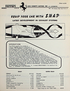 Einblattprospekt / Preisliste „Luigi Chinetti Motors Inc.“, SNAP Abgasanlagen für Ferrari, engl. Text, guter Zustand