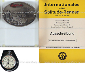 Konvolut 3 tlg. darunter Stoppuhr "Mythos Solitude", von J. Bruhn Stuttgart, 2003, funktionsfähig; Ausschreibung "Internationales ADAC Solitude-Rennen 1966", welches nie stattfand, sowie Plakette 100 Jahre Solitude 25.-27. Juli 2003, insgesamt guter Zustand