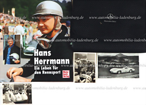 Konvolut 5 tlg. darunter 2 original s/w Aufnahmen, einmal W196 R Stromlinie #14 vor Renntransporter Großer Preis von Italien 1954 sowie Alfred Neubauer am W196 von Hans Hermann #12 10x7 cm. Limitiertes handsgniertes Buch "Hans Hermann-Ein Leben für den Rennsport; s/w Fotopostkarte W196 R Stromlinie 9x14 cm. dazu Bordmappe A-Klasse