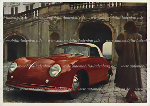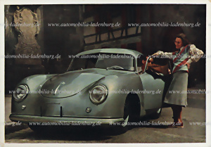 1950, Porsche Werbekarte mit Farb- Werbeaufnahme Porsche 356 preA Cabriolet "Split Window", guter Zustand 10,5x15 cm.