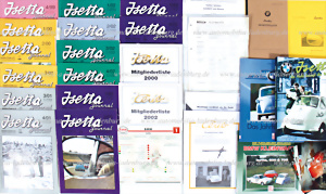 Konvolut über 30 tlg. BMW Isetta, darunter Kopie Ersatzteilliste Ausgabe Juli 1955, laminierter ESSO Schmierplan; Blatt mit Bosch Testwerten; " Teilekataloge von Hans Rothkegel, sowie einer des Isetta Club e.V.; 14 Ausgaben "Istetta Journal" Mitglieder Zeitschrift von 1999-2003, sowie 2 Mitgliederlisten, dazu 3 Isetta Bücher und 6 Farbfotos einer Isetta.