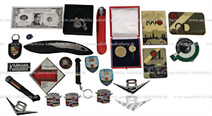 Konvolut über 45 tlg. Accessoires und Werbegeschenke, darunter 80er Jahre Schedoni Ferrari Anhänger; Ferrari Teelöffel, gepunzt "Sambonet"; Ferrari 50 Jahre Jubiläums - Pin; 2 Ferrari Aufkleber; Porsche Anhänger & 6 Porsche Dollar; ADAC Pin & Verdienstmünze; Colani Brieföffner; Mercedes Messko Reifendruckprüfer; 3 Plaketten Mercedes Veteranentreffen; Mille Miglia 1972 Plakette, etc. gebrauchter Zustand