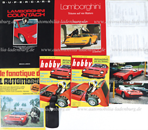 Konvolut 22 tlg. darunter u.a. 2 Bücher: "Lamborghini Countach" & "Lamborghini Träume auf vier Rädern"; 13 Farbfotos Miura P400 (wohl #3366); Lamborghini Leder Handyhülle; 2 Kopien Typenberichte Countach LP 400, ital. Text; Kopie TÜV Musterbericht P400 Miura für Hubert Hahne, de. Text; 3 Magazine mit Miura Test Berichten