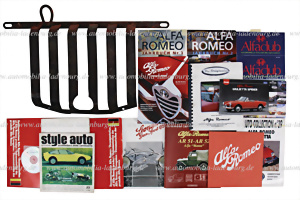Konvolut über 20 tlg. darunter Motorschutzschild für Giulia 1962-1977; 4 Pressemappen: Alfa 33 4x4; Autosalon Frankfurt; Forschung sowie Leontina Gran Sport 5 Werbekarten, Rückseite mit Beschreibungen dazu zahlreiche Zeitschriften