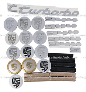 Konvolut 28 tlg. darunter 5 mal Schriftzug "944 s"; 3 mal "Turbo", neuwertiger Zustand; 13 Radnabenabdeckungen, teilweise mit Gebrauchsspuren sowie 2 Sets "16 Ventiler Schriftzug", einmal gold einmal grün metalic,