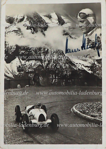 Handsignierte original s/w Fotopostkarte, Hans Stuck auf Auto Union Typ C, Bergrennen 1938, 15x10cm