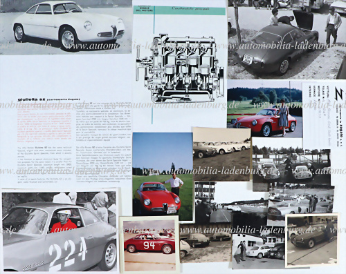 Konvolut 10 original s/w Aufnahmen, unter anderem Alfa Romeo GSZ Coda Tonda (#067), dazu Kopie, technisches Datenblatt Alfa Romeo Giuletta SZ, 3 Farbaufnahmen; Alfa Romeo Giuletta Sprint Veloce, verschiedene Formate