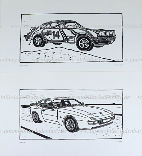 Portfolio innen mit 12 Kunstdrucken, darunter zum Beispiel, Porsche 911 Safari, Porsche 944, Porsche 924 Turbo, Porsche 928S, Porsche 916, Porsche Formel 1, Porsche 356 1, etc., je 42x59cm