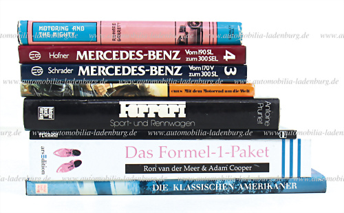 Bücherkonvolut 8 tlg.,, darunter "Ferrari Sport-und Rennwagen Prototypen" von Antoine Prunet;"Ferrari" von Brian Laban;"Die Klassischen Amerikaner"; zwei Bände (3 und 4) "Mercedes-Benz Automobilie" von Schrader/ Hofner;"Mit dem Motorrad um die Welt" von Crius;"Motoring and the Mighty" von... mehr