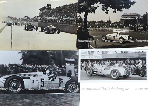 Konvolut 3 original s/w Aufnahmen sowie 1 s/w Abzug neueren Datums, "Rennszene 1935, GP Frankreich", Achille Varzi auf Auto Union Typ C, GP Hungarian Budapest 1936", Rennszene 1937, sowie s/w Abzug Nuvolari auf Auto Union, verschiedene Formate