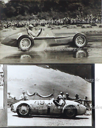 Konvolut 2tlg., darunter original s/w Aufnahme, Juan Manuel Fangio auf Alfa Romeo 158, GP Silverstone 1950, dazu s/w Abzug, Bergrennen "Freiburg Schauinsland 1951", wohl Veritas Rennwagen, verschiedene Formate