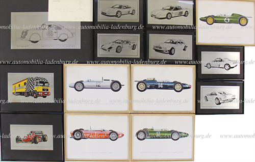 Konvolut 14tlg., 9 Zinngrafiken von Andreas Hentrich, darunter Porsche 356 Alu-Coupe 1951, Ferrari 288 GTO, Ferrari 348 TS, Ferrari F40, Jaguar Sedan, Ferrari 348 TB, Ferrari Testarossa, Ferrari 312 T1, sowie Dunlop Renntransporter, dazu 5 Kunstdrucke, u.a. Lotus Formel 1 1962, Lola Formel 1 1962,... mehr