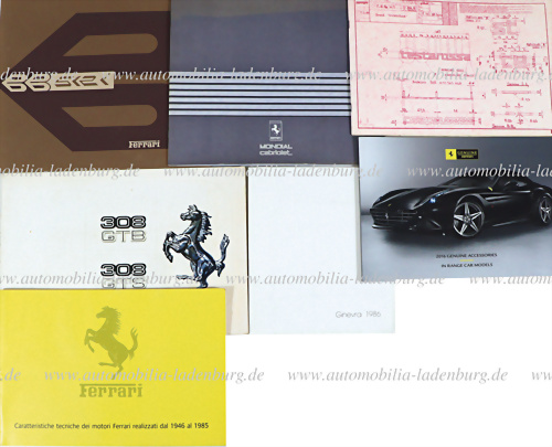 Konvolut 7tlg., darunter Verkaufskatalog/Pressemappe Ferrari Testarossa, inkl. 2 Pressefotos (324/84), deutscher Text; Verkaufskatalog Ferrari BB 512i (221/81); Verkaufskatalog Ferrari 308GTB/GTS (147/77); Verkaufskatalog Ferrari Mondial Cabriolet (313/84); Broschüre der produzierten Ferrari Motoren... mehr