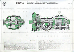 Konvolut 5 Werbeplakate/Werkstattaushänge, Lancia Fulvia darunter, "Vorderradaufängung", "Kupplung/Wechselgetriebe/Ausgleichgetriebe", "Motor", "Bremsanlage Duplex", sowie "Kontroll und Wartungsarbeiten", 117x84cm, kleinere Einrisse an den Rändern sonst guter Zustand
