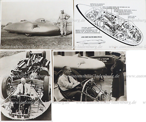 Konvolut 4 original s/w Aufnahmen, John Cobb, "Railton Mobil Special" Rekordwagen, je 13x18cm