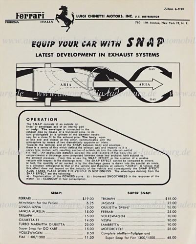 Einblattprospekt / Preisliste „Luigi Chinetti Motors Inc.“, SNAP Abgasanlagen für Ferrari, engl. Text, guter Zustand