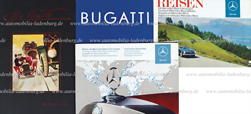 Konvolut 4tlg., darunter 2 Servicehefte "Mercedes-Benz-Reisen", dazu 2 Reprint Verkaufskataloge Bugatti, guter Zustand