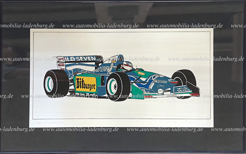 Zinngrafik von Andreas Hentrich, Motiv Michael Schumacher auf Benetton Ford F1, limitierte Auflage 002/100, (ohne Zertifikat), 50x81cm, gerahmt