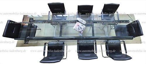 Konferenztisch / Glastisch, Nachbau Auto Union Typ C Fahrgestell, dazu 8 Stühle, 2 Glasplatten (je 169cm), Länge 328cm, Breite 93cm, Höhe 79,5cm (inkl. Modellauto CMC und Buch) !! ACHTUNG nur für Selbstabholer !!
