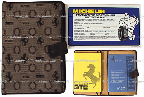 Bordmappe, Ferrari 308 GTB, innen Betriebsanleitung (116/75), dreisprachige Ausführung, Händlerverzeichnis 1977, sowie Michelin Garantie-Heft (11/78), gebrauchter Zustand, beschädigter Verschluss.
