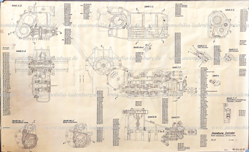 16./19.4.1956, Konvolut zwei original Blaupausen Konstruktionszeichnungen Mercedes Benz W196, Anordnung Getriebe Blatt 1 und Blatt 2, (1960000026), Maßstab 1:1, je 186x117cm, Rarität