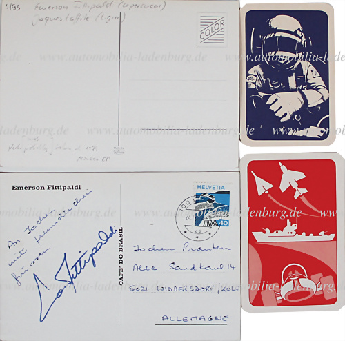 Konvolut 4tlg., darunter handsignierte Postkarte; 2 handsignierte Quartettkarten, sowie handsignierte Farbaufnahme, signiert von Emerson Fittipaldi und Jacques Laffite