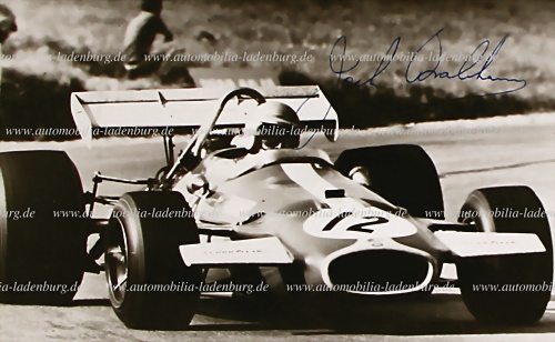 Handsignierte original s/w Aufnahme Jack Brabham auf Brabham BT33, GP Südafrika 1970, 9x14cm