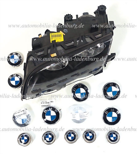 Erstzteilkonvolut 14tlg., darunter: Original Frontscheinwerfer links für 3er BMW (0 301 089 205), Embleme für Kofferraum u. Motorhaube E3/E9/E12, 4 Radkappen 14"/16", 2 Nabendeckel 68mm, sowie 5 Nabenabdeckungen 3er (36131114180); sehr guter Zustand