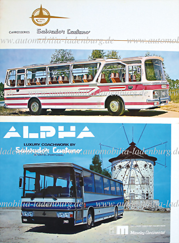 Konvolut 2tlg., darunter Faltprospekt Alpha „Luxury Coachwork by Salvador Caetano“; Verkaufsmappe Carrosserie Salvador Caetano, innen mit 6 Einblattprospekten u.a. Single Decker Bus; Double Decker Bus; Luxury Coach; Leyland Gran Turismo Bus; Vans and Special Vehicles