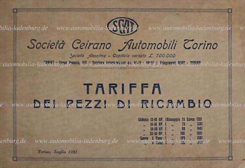 Juli 1921, Ersatzteilpreisliste für SCAT "Societa Ceirano Automobili Torino" Chassis 12-18HP / 15-18HP / 18-30HP / 25-35HP / 2 Tonner / 4 Tonner, 70 Seiten italienischer Text, guter Zustand, selten