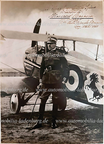 Original s/w Aufnahme, Francesco Baracca neben seinem Jagdflieger mit dem „Cavallino Rampante“ Emblem. Die Aufnahme trägt eine handschriftliche Widmung mit Signatur von Baraccas Mutter, Contessa Paola Biancoli Baracca, datiert Oktober 1923, jenem Jahr, in dem sie Enzo Ferrari nach seinem Sieg auf... mehr