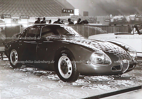 Konvolut 3 original s/w Aufnahmen, Alfa Romeo Giulietta Sprint Zagato auf Messestand, 10,5x15cm