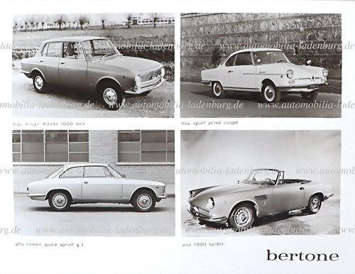 Einblattprospekt mit 4 s/w Aufnahmen, darunter ASA 1000 spider, Alfa Romeo Giulia Sprint G.T., NSU Sport Prinz Coupe und Tokyo Kogyo-Mazda 1000, 18x24cm