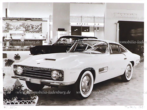 Konvolut 3 original s/w Aufnahmen Ghia 450SS auf Messestand, Rückseite gestempelt "Publifoto Milano", 18x23,5cm